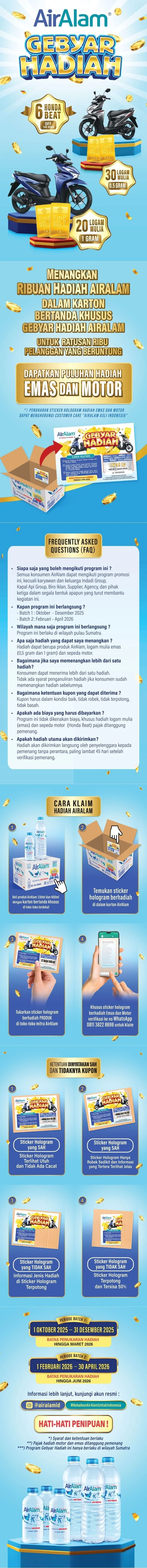 Hadiah Logam Mulia (Emas) & Sepeda Motor (Honda beat) dapat diklaim dengan cara mengirimkan chat WhatsApp ke Customer Care “AirAlam Asli Indonesia” di nomor 0811 3822 8698.